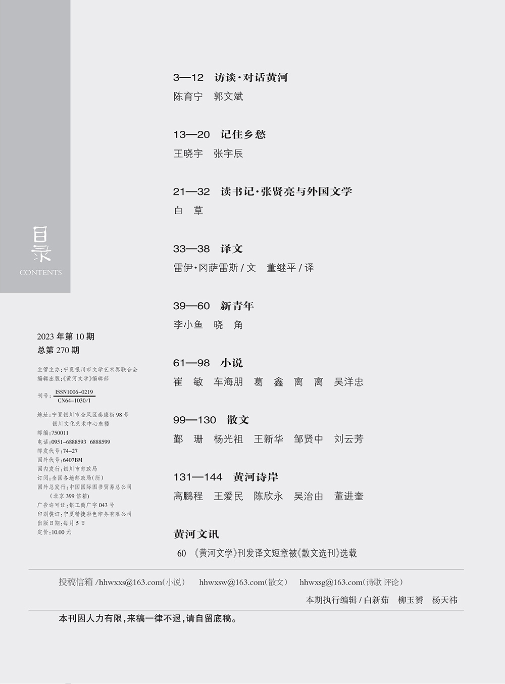 《黄河文学》2023年第10期目录