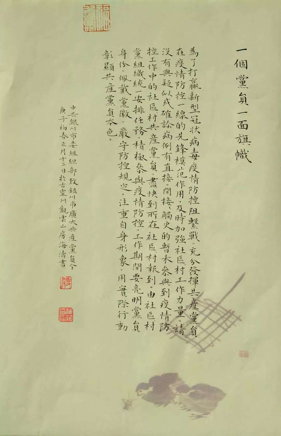 2020年春节期间,新型冠状病毒肆虐全国,生命重于泰山、疫情就是命令、防控就是责任。全国上下万众一心、众志成城坚决打赢疫情防控攻坚战。在这场没有硝烟的战疫中,银川市文艺工作者积极行动起来,以应对阻击疫情为主题,精心创作文艺作品,宣传在党的领导下抗击疫情中大爱无疆、人间真情、温暖人心的感人事迹,用艺术作品鼓舞人心、振奋精神、凝聚力量。