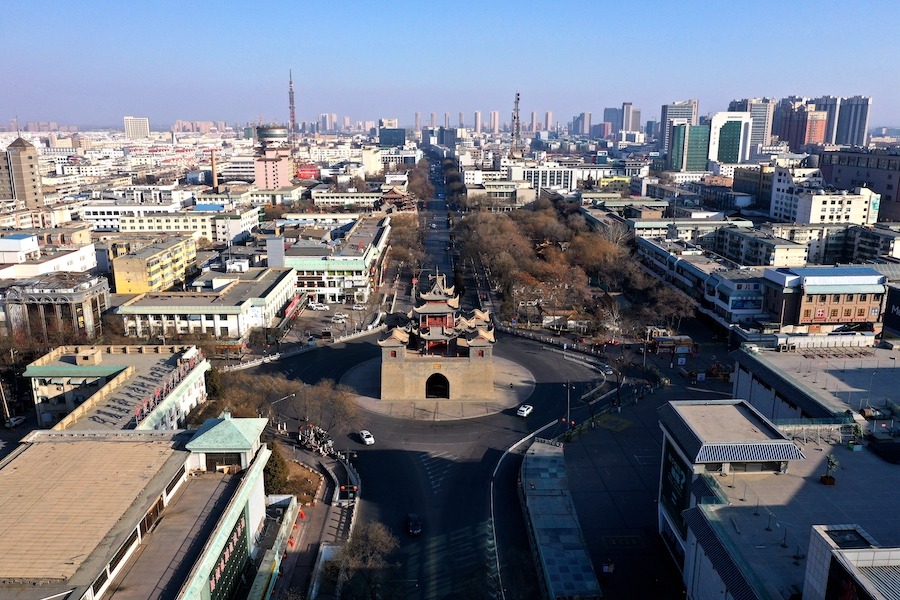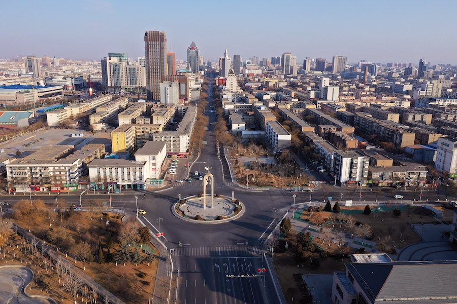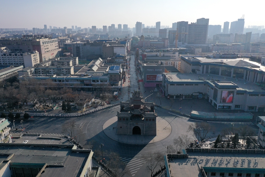 5:40分,在风凰碑上空鸟瞰东大街,干净的街道上行人稀少。银川市民都在响应市委的号召,模范做到不出门、少走动、不传染,为配合全国人民共同防控好冠状病毒。