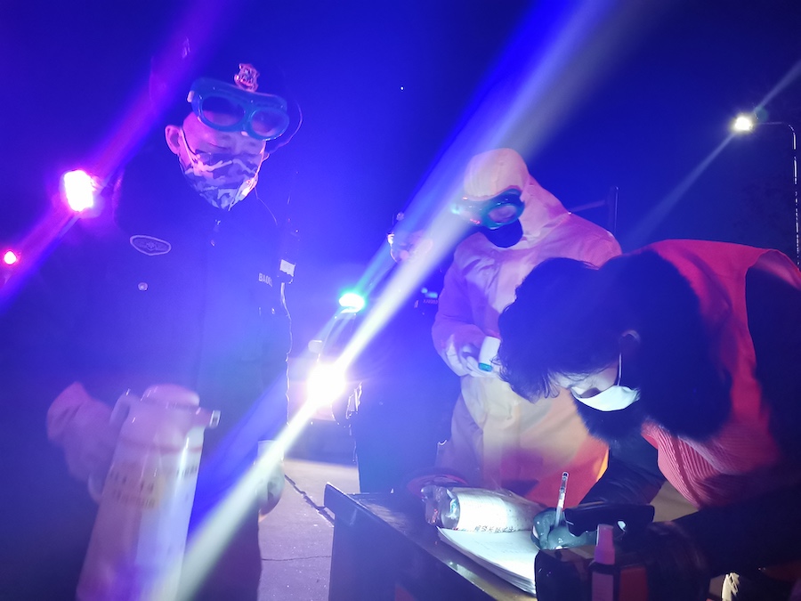 在银川通往石嘴山的石银高速路口,我找到了自己的拍摄对像。他们是由来自市交通运输局、交警总队、西夏区公安分局、镇北堡镇党政、石银收费站和志愿者等八家单位临时组成的联合执勤小组。他们的工作任务是检查登记、测量体温、消毒、留置观察等。从年龄上来看,这些人中有年轻的也有年长的,但他们每一个都是极其认真地做好自己的工作,完全可以用一丝不苟和严防死守来形容。