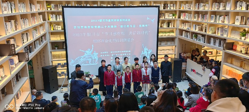 4月5日,“我们的节日·清明节”2023年银川市“节日感党恩 共话新时代”缅怀革命先烈诗词朗诵会在银川举行,为市民群众献上了一场朗诵艺术的盛宴。朗诵艺术家们与阅海四小的师生一起朗诵《闪闪的红星》等名篇,在人潮涌动的钟书阁书店,用声音表达对革命先烈的追忆,用诗歌点燃传承革命精神的火焰。