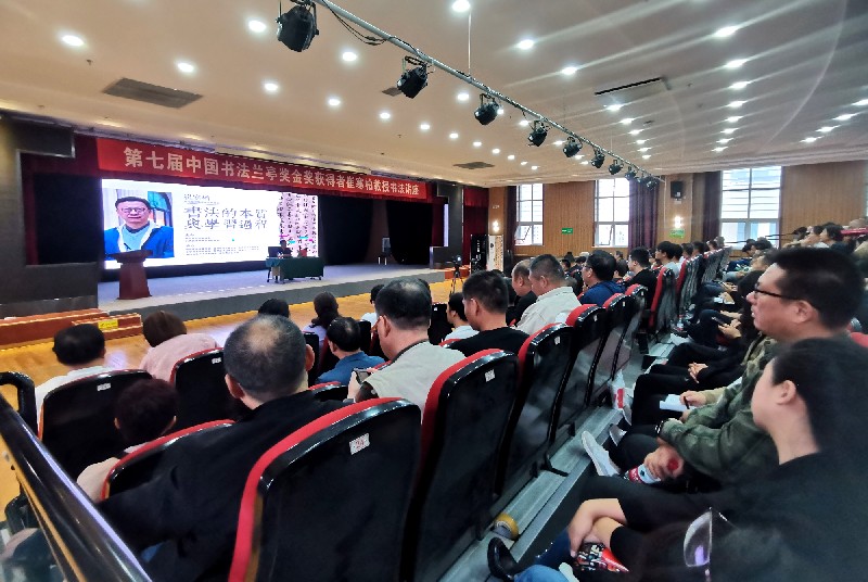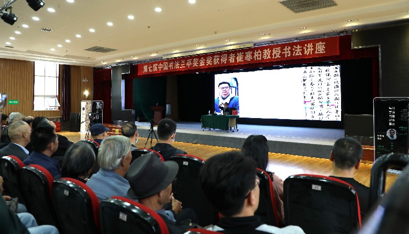 宁夏文联一级巡视员苏保伟,宁夏书协副主席王奋勤,宁夏书协主席团委员、宁夏大学书法研究所所长杨开飞,宁夏书画院创研室主任杨华,兴庆区文联副主席赵菊芬,银川市书协副主席兼秘书长雷长林,副主席王博如、牛尔惠、郭鸿光、席 恒、屈子强及来自银川各县市区书协,银川市青年书协、老年书协、老年大学及宁夏各高校学生450余名书法爱好者齐聚一堂,座无虚席,认真聆听了崔寒柏教授的讲座。