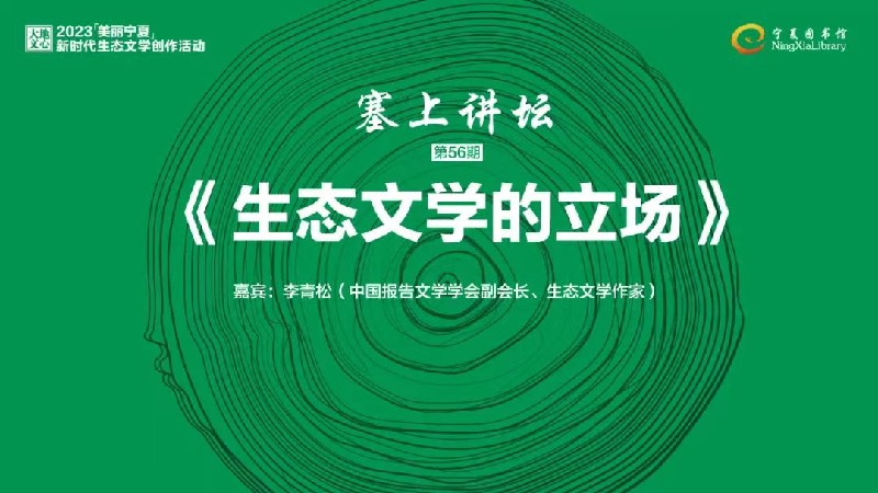 2023年8月15日,恰逢首个全国生态日,一场特别的主题讲座在银川市国际交流中心举行。荣幸邀请到中国报告文学学会副会长李青松就「生态文学的立场」与现场百余位观众进行了分享,此次分享是文学照亮生活公益大讲堂之一,同时也是塞上讲坛第56期。