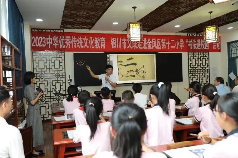 为大力开展中华优秀传统文化教育,近年来,银川市文联以承载着中华传统文化精粹的书法艺术为切入点,常态化组织书法家走进我市中小学,普及中国书法知识,现场讲解、示范,提升中小学生书法审美能力,增强对书法艺术的兴趣,从而喜欢上书法,练习书法,让中国书法艺术在青少年中得到弘扬和传承。