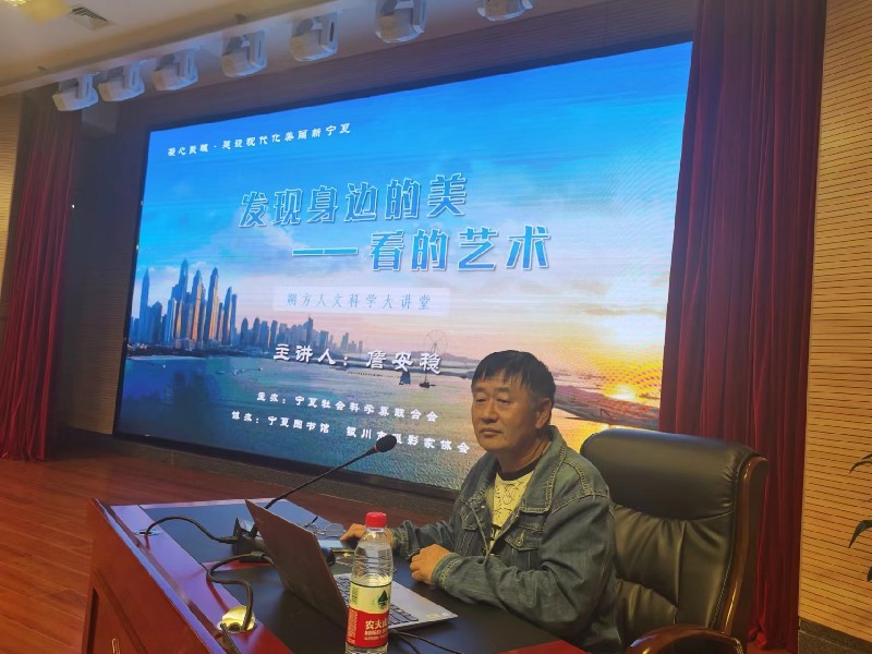 为普及摄影艺术知识,提升宁夏摄影爱好者的摄影艺术水平,5月24日下午3点,在宁夏回族自治区图书馆报告厅,银川市摄影家协会主席詹安稳受邀做客由宁夏社会科学界联合会、宁夏图书馆、银川市文联、银川市摄影家协会联合举办“凝心聚魂·建设现代化美丽新宁夏”朔方人文科学大讲堂,以线上线下形式,作了题为《发现身边的美——看的艺术》摄影专题讲座。