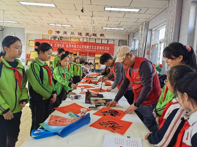 当天下午,兴庆区文联及宁夏塞外书画艺术研究会的艺术家50多人走进兴庆区景岳小学,开展传统文化进校园文艺志愿服务活动,为景岳小学的红孩子们带来了一场艺术盛宴。艺术家们现场挥毫,写福字、写春联、画国画,孩子们在现场观摩的过程中学习福字的写法,感悟书法的魅力。兴庆区文联为学校赠送红色诗词书法作品20余幅,同时组织艺术家走进课堂,为孩子们讲授书法、剪纸、绳结、朗诵等方面的知识和技巧,大大激发了学生热爱汉字,崇尚传统文化的热情。
