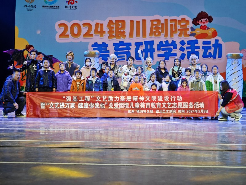 2024年2月3日下午,银川市文联、银川艺术剧院联合银川市金凤区望梅文明实践社会发展中心,共同开展了“强基工程”文艺助力精神文明建设行动暨“文艺进万家 健康你我他”关爱困境儿童美育教育文艺志愿服务活动,40名困境儿童在银川艺术剧院共同观看了大型多媒体音乐舞台剧《冰雪女王之终极魔法》。