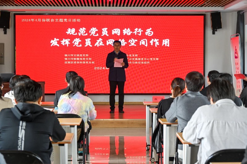 为认真学习贯彻《中国共产党党员网络行为规定》精神,严格规范党员网络行为,进一步激励引导基层党组织和广大党员在网络空间充分发挥战斗堡垒作用和先锋模范作用,按照《关于在市直机关开展四月份“支部主题党日”的通知》,2024年4月19日,由银川市文联党支部牵头,联合银川市委网信办党支部、银川市数据局党支部、银川市大数据产业发展服务中心党支部、西夏区委宣传部党支部、银川市文艺家协会功能型党组织走进西夏区新时代文明实践中心开展“规范党员网络行为,发挥党员在网络空间作用”主题党日。
