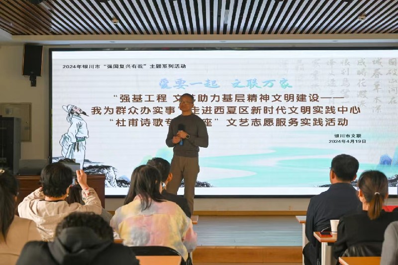 为充分发挥好新时代文明实践中心的精神文明建设阵地作用,切实办好丰富群众精神文化生活的文艺实事,用优质文艺力量提升精神文明建设活动质量,更好地满足人民群众日益提高的精神文化审美需求,银川市文联特邀请宁夏大学教师杨胜利老师,为现场党员群众作了一场题为“杜甫与现实主义”的诗歌专题讲座。在短短一个半小时的时间里,杨胜利老师精炼讲述了诗圣、诗史杜甫的人生历程,随后,重点了讲解了杜甫的《自京赴奉先县咏怀五百字》《石壕吏》《茅屋为秋风所破歌》等现实主义诗歌名篇,结合杜甫的人生历程,大家对诗歌的理解变得尤为深入,不时呈现共同齐诵杜甫经典诗歌名篇的暖心场面。杜甫生活在人民中间,对人民疾苦的深入了解,使他的诗歌不仅具有深刻的思想内蕴,而且具有历久弥新永恒的动人艺术魅力。杜甫诗歌的巨大成就,也为现今文艺工作者坚持“深入生活,扎根人民”的创作实践,提供了有益的借鉴。
