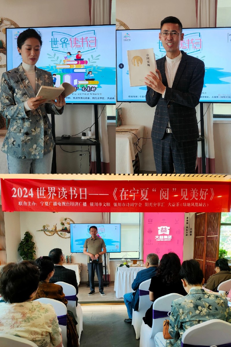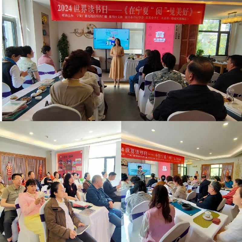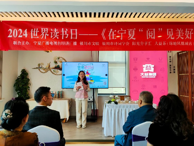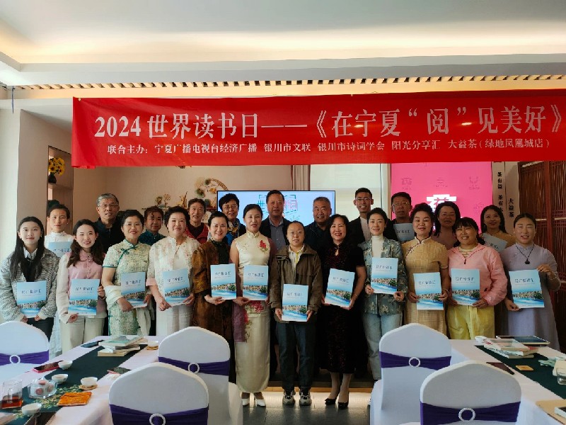 以习近平新时代中国特色社会主义思想为指导,围绕贯彻党的二十大关于文化建设的战略部署,积极营造全社会爱读书、读好书、善读书的浓厚氛围,2024年4月23日,在第29个世界读书日之际,宁夏经济广播联合银川市文联、银川市诗词学会、阳光分享汇、大益茶(绿地凤凰城店)共同举办2024世界读书日——“在宁夏‘阅’见美好”读书分享汇活动,推动全民阅读走深走实。