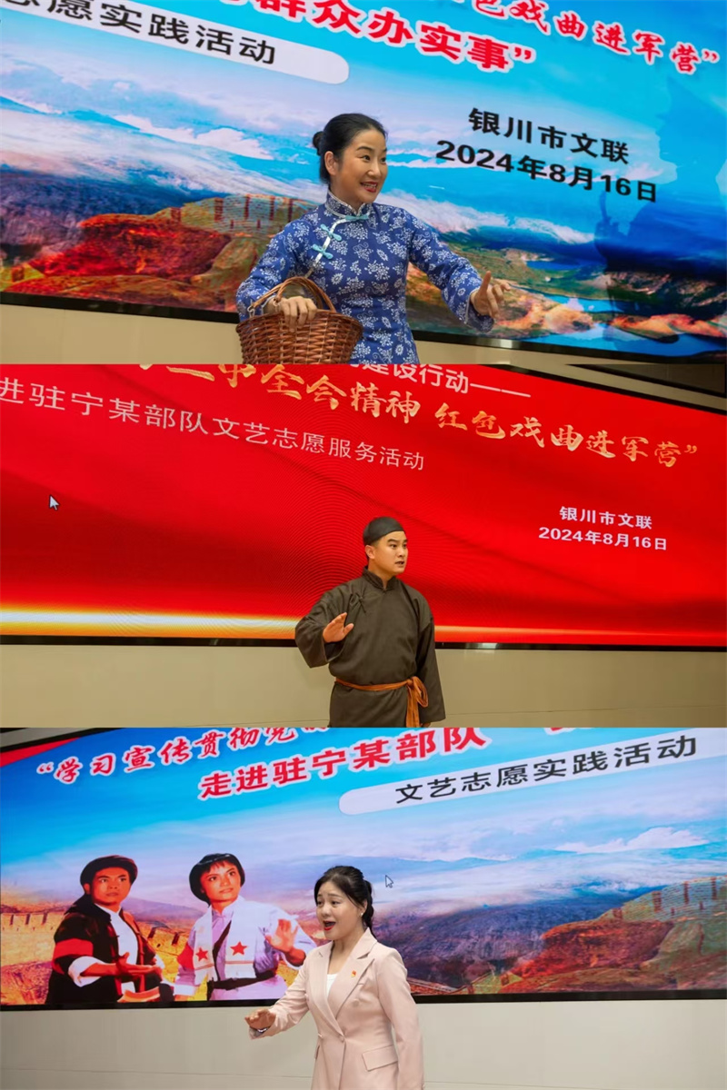 宁夏京剧院国家一级演员王娜、优秀青年演员王蒙、马智,银川市戏剧家协会国家一级演员李小荣、国家二级演员鱼亮、李梦聪分别为现场部队官兵带来了京剧《江姐》《红灯记》《智取威虎山》选段和秦腔《洪湖赤卫队》《血泪仇》眉户剧《大家喜欢》的精彩选段。