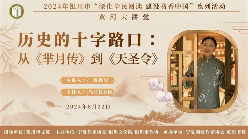 2024年8月22日,《历史的十字路口:从<芈月传>到<天圣令>》主题讲座在银川市黄河书苑举行,温州大学网络文创研究院院长,温州大学人文学院研究员,知名作家、编剧蒋胜男为众多读者献上了一场极具感染力的文学讲堂,温州大学人文学院副教授、中国作协少数民族文学委员会委员乌兰其木格主持讲座。