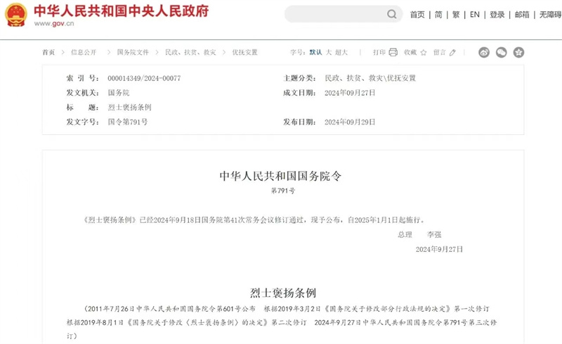 国务院总理李强日前签署国务院令,公布修订后的《烈士褒扬条例》(以下简称《条例》),自2025年1月1日起施行。