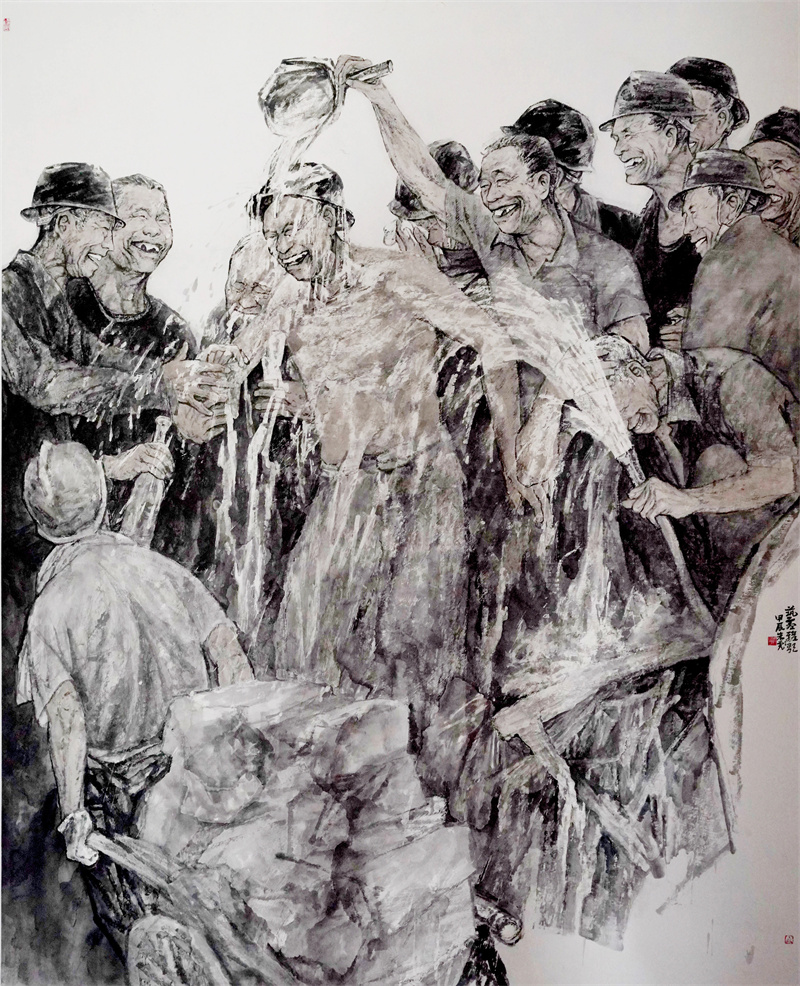 10余年来,朱彪一直围绕贺兰山下的移民劳动者创作群像。“他们30多年前从大山里搬出来,在贺兰山下安居落户。宁夏葡萄酒产业萌芽初期,这些劳动者便参与了进来。”朱彪说,他喜欢在贺兰山脚下观察这些劳动者的生活,从种植、采摘、压条、酿酒……朱彪目睹着劳动者的辛勤劳作,观察葡萄的生长过程,从发芽到结果,从酿酒到生产,每一个阶段都充满了生命的奇迹。他用画笔创作出一幅幅劳动场景,将贺兰山下葡萄的生机和劳动者收获的喜悦定格在画布上。