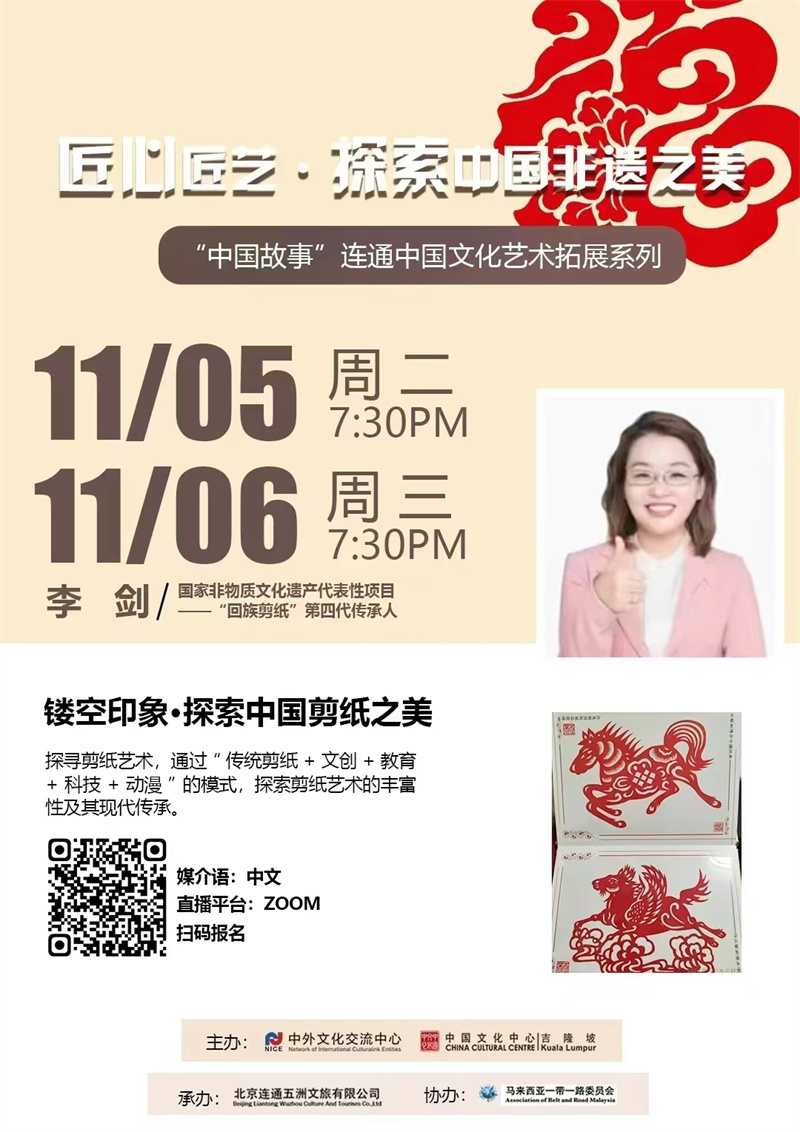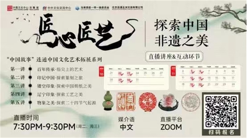 由中外文化交流中心、吉隆坡中国文化中心主办,北京连通五洲文旅有限公司承办,马来西亚一带一路委员会协办的《中国文化匠心匠艺—探索中国非遗之美》“中国故事”连通中国文化拓展系列讲座将于2024年10月22日至11月20日期间举行,特邀多位非物质文化遗产传承人及专家,带领大家深入探索中国非遗文化的魅力,旨在让民众深入体验和感悟中国非遗文化的多样魅力与创新实践。
