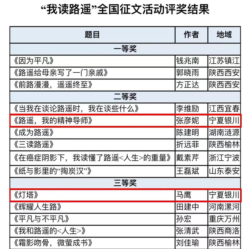 2024年11月27日,由中国作家协会全民阅读推广办公室、陕西省作家协会等机构联合主办的“我与路遥”全国征文活动评奖结果揭晓。本次征文活动共收到近5000篇作品,经过初评委员会的认真阅读与评审,评选出100篇初选作品。随后,终评委员会进行深入阅读与讨论,最终评选出获奖作品,其中一等奖3篇,二等奖6篇,三等奖10篇,优秀奖12篇。其中,银川市作家彦妮的文章《路遥,我的精神导师》荣获“二等奖”,马鹰的文章《灯塔》荣获“三等奖”。