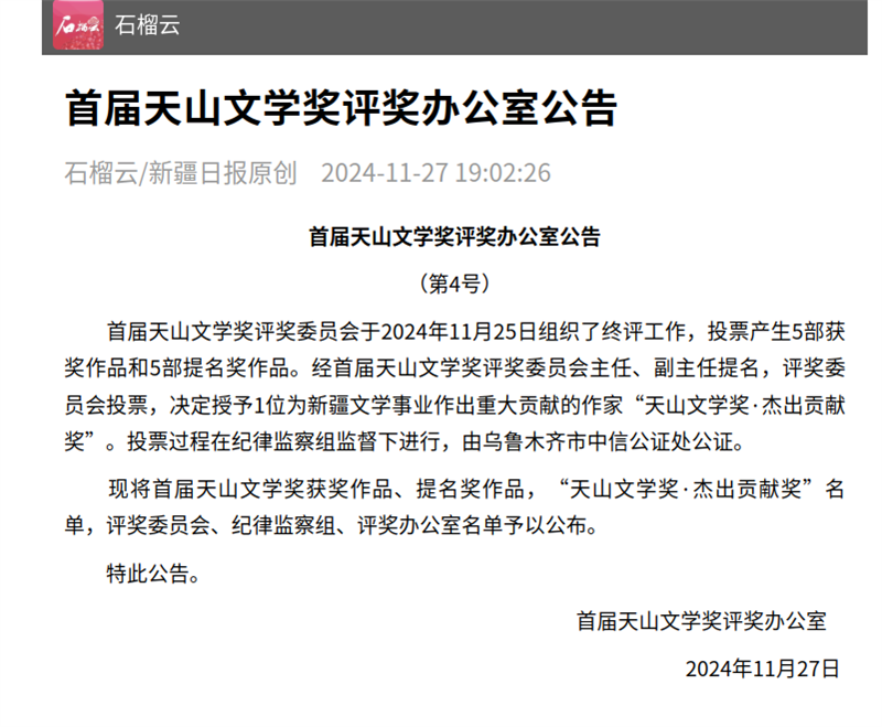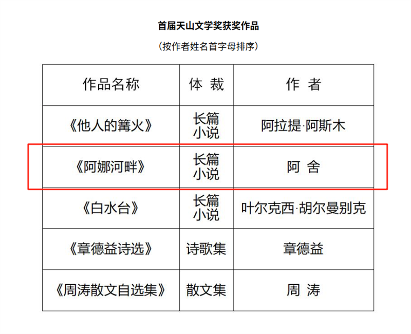 备受瞩目的首届天山文学奖于近日公布获奖名单,5部获奖作品和5部提名奖作品榜上有名,宁夏作家协会副主席、银川市作家协会主席阿舍的长篇小说《阿娜河畔》继获得骏马奖和入选“五个一工程”优秀作品奖后,又获首届天山文学奖,获奖作品每部将奖励人民币50万元。天山文学奖表彰新疆题材文学精品,旨在展现团结和谐、繁荣发展的美丽新疆。