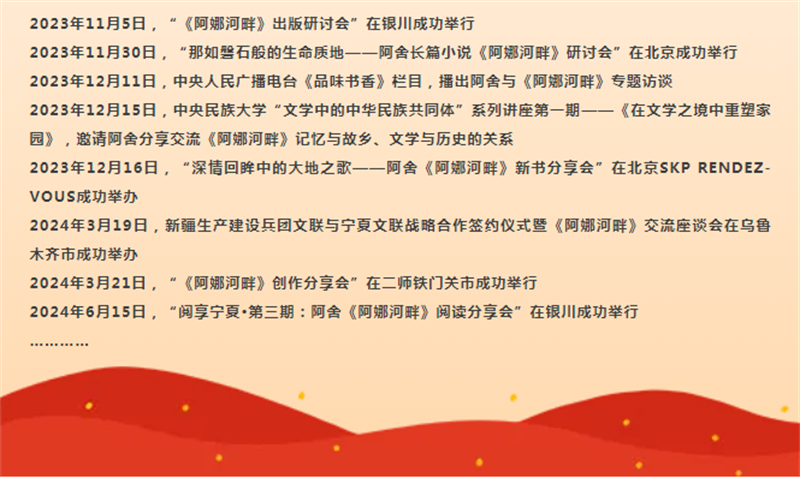 近日,中宣部第十七届精神文明建设“五个一工程”获奖名单公布。银川市作协主席阿舍的长篇小说《阿娜河畔》喜获图书类优秀作品奖。这是该作品荣获第十三届全国少数民族文学创作骏马奖长篇小说奖、首届天山文学奖后,又斩获的一个重要奖项。