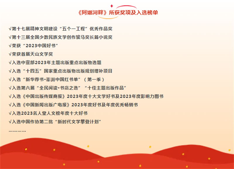 从《诗在远方——“闽宁经验”纪事》《出路》到《阿娜河畔》,集团实现了精品出版物连续三年获评“中国好书”、连续两届荣获“五个一工程”奖的优异成绩,接续了集团主题出版发展的强劲势头,成为了“黄河出版”品牌建设的重要驱动。此前,《阿娜河畔》获“2023中国好书”、第十三届全国少数民族文学创作骏马奖长篇小说奖、首届天山文学奖。