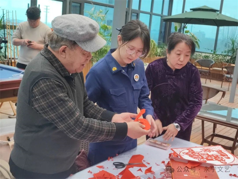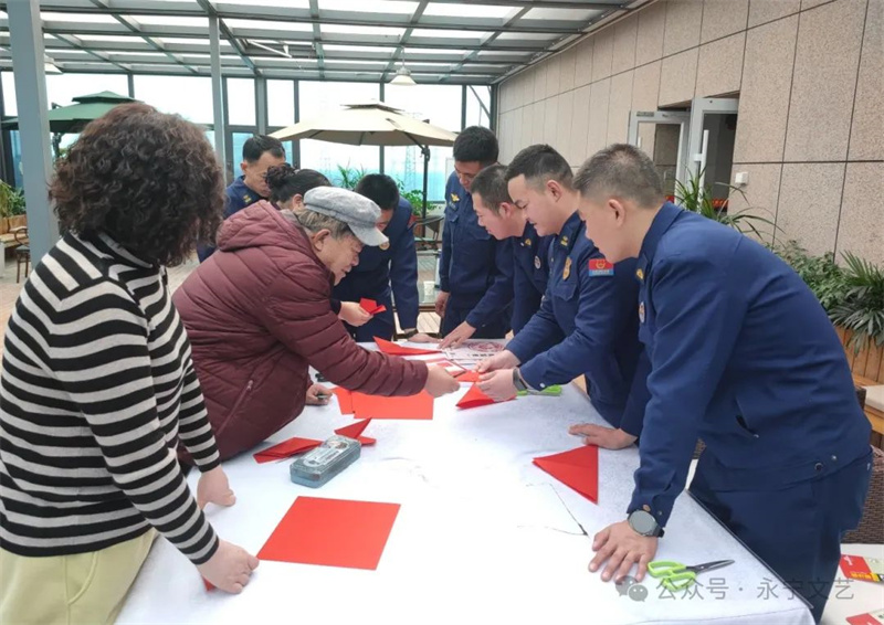 活动现场,永宁县民间艺术协会的艺术家们耐心为消防员官兵科普剪纸历史渊源,从如何选纸、叠纸、下剪等方面深入浅出地进行讲解。消防员们表情专注,认真聆听,剪刀在他们手里时而快速游走,时而细致转动。百炼钢也能化作绕指柔,经过两个小时的“紧张战斗”,一张张红纸在消防员的手中变成有模有样的剪纸艺术品。