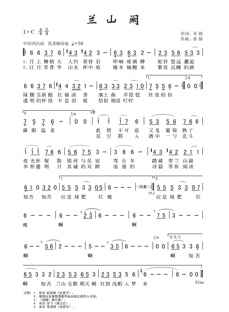 这首现代“中国古风”流行民谣,抒发了美丽宁夏贺兰山下浪漫东麓的中国葡萄酒情怀,形象地展示出宁夏葡萄酒文化的魅力与精彩。歌词中引用中国经典诗句“月上柳梢头,人约黄昏后”“驾长⻋踏破贺兰山缺”“知否知否,应是绿肥红瘦”,再现丝路美酒、贺兰山阙、把酒言欢、仰望星空,尽显穿越时空古今情怀的唯美场景。音乐采用交响弦乐加中国民族乐器竹笛、琵琶、古筝、中国大鼓的旋律色彩,演绎绚丽的中国古韵流行风。是中国古典音乐风格与时尚流行音乐的⼀次全新体验。