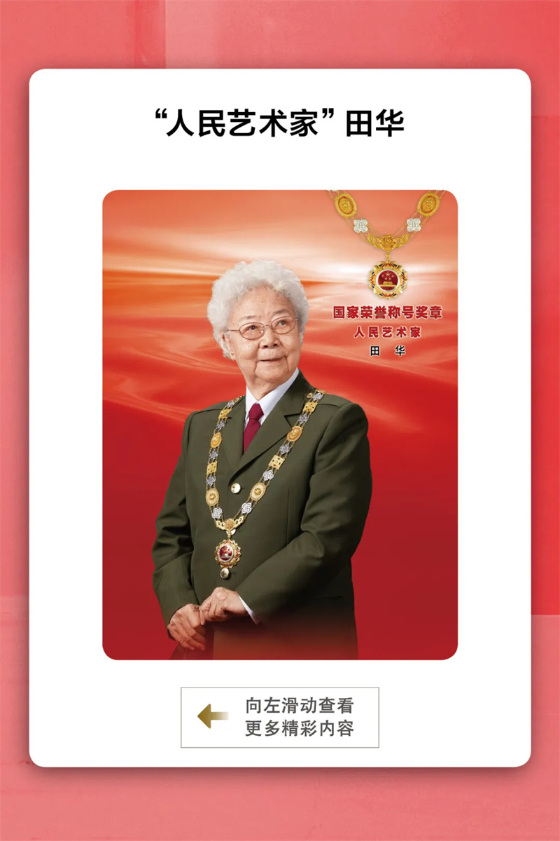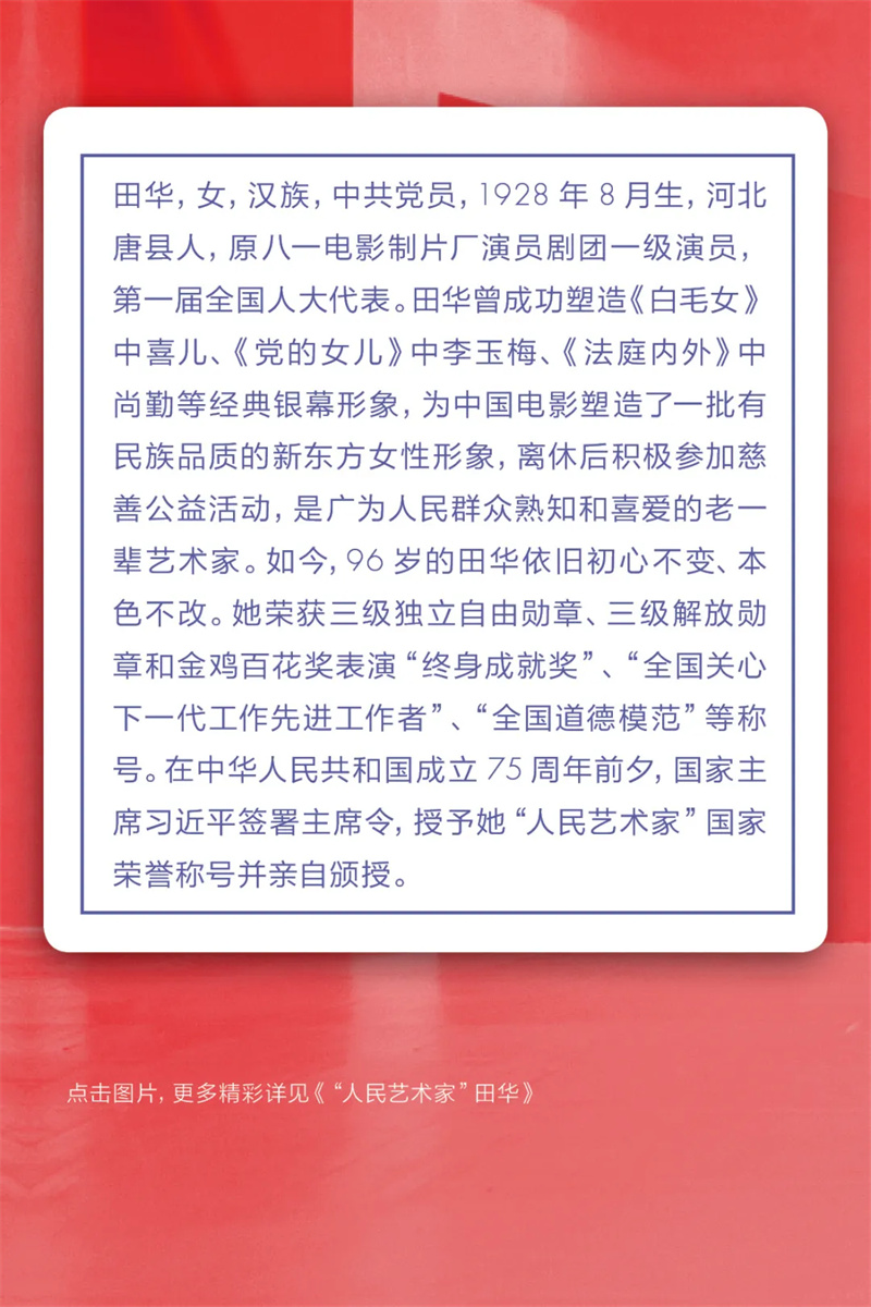 “既演好‘党的女儿’角色,又永葆‘党的女儿’本色,是我不懈的人生追求。”如今,96岁的田华依旧初心不变、本色不改。她荣获三级独立自由勋章、三级解放勋章和金鸡百花奖表演“终身成就奖”、“全国关心下一代工作先进工作者”、“全国道德模范”等称号。在中华人民共和国成立75周年前夕,国家主席习近平签署主席令,授予她“人民艺术家”国家荣誉称号并亲自颁授。