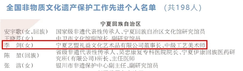 2024年10月28日,文化和旅游部发布《关于表彰全国非物质文化遗产保护工作先进集体和先进个人的决定》(以下简称《决定》),授予100个单位“全国非物质文化遗产保护工作先进集体”称号,授予198人“全国非物质文化遗产保护工作先进个人”称号,宁夏回族自治区政协委员、银川市民间文艺家协会主席李剑荣获“全国非物质文化遗产保护工作先进个人”。