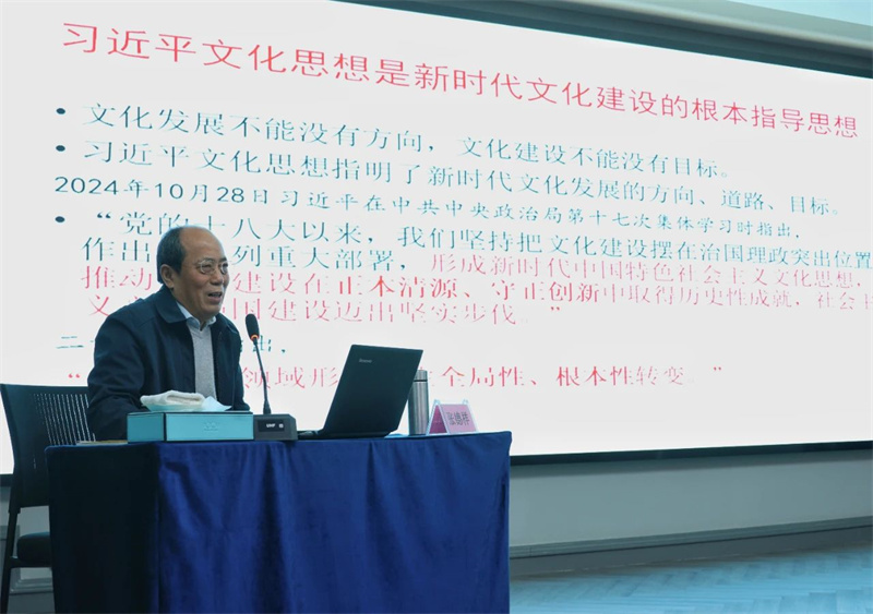 2月26日上午,中国文艺评论家协会副主席张德祥作了题为《习近平文化思想与文化强国建设》的专题讲座。他从为什么要建设文化强国、建设什么样的文化强国、怎样建设文化强国三个方面,深刻解读了习近平文化思想的基本内涵和重要意义。张德祥指出,习近平文化思想是新时代文化建设的根本指导思想,为文化强国建设提供了根本遵循和行动指南。他强调,文艺工作者要深刻领会习近平文化思想的精髓要义,切实增强文化自信和文化自觉,为推动社会主义文化繁荣兴盛贡献智慧和力量。