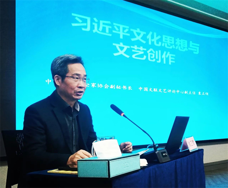 2月28日上午,中国文艺评论家协会副秘书长、中国文联文艺评论中心副主任袁正领作了题为《习近平文化思想与文艺创作》的专题讲座。他从民族复兴与文艺的使命、以人民为中心的创作导向以及深入生活、扎根人民的根本创作方法等方面,深入论述了习近平文化思想与文艺创作的关系。袁正领指出,习近平文化思想为文艺创作提供了根本遵循和行动指南,文艺工作者要深刻领会其精髓要义,切实增强文化自信和文化自觉,坚持以人民为中心的创作导向,深入生活、扎根人民,创作出更多反映时代精神、体现人民意愿的优秀文艺作品。