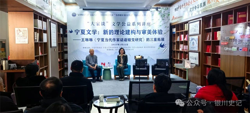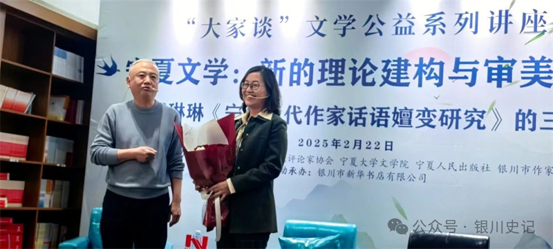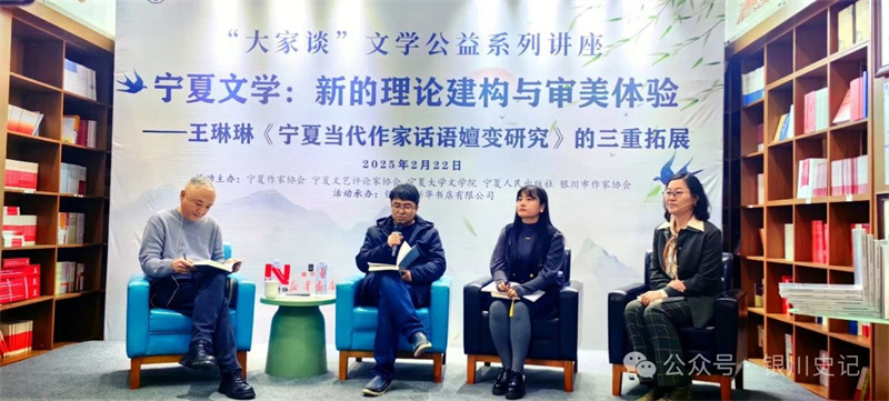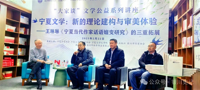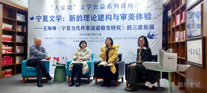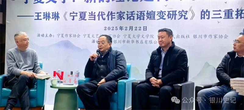 “ 这是王琳琳继《张贤亮文学和电影作品比较研究》之后,又一部以宁夏当代文学为研究对象的学术著作,也是当代宁夏文学研究的又一新的学术成果和重要收获。” 2月22日,著名评论家、宁夏大学文学院教授王岩森告诉记者,王琳琳的学术新著《宁夏当代作家话语嬗变研究》以宁夏当代文学话语嬗变、话语特色为中心,综合运用文化学、媒介传播学、叙事学的理论、方法,从媒介记忆、媒介交融和媒介符号多个方面,描述、分析20世纪70年代末以来宁夏文学的生成、演进,诠释、评价其价值、意义,为当代宁夏文学研究提供了新的范式和可能。 当天,由宁夏作家协会、宁夏文艺评论家协会、宁夏大学文学院、宁夏人民出版社、银川市作家协会主办的“大家谈”文学公益讲座2025年第1期“宁夏文学:新的理论建构与审美体验——王琳琳《宁夏当代作家话语嬗变研究》所呈现的三重拓展”阅读分享会在银川市新华书店银川书城店举办,来自宁夏的作家、评论家、出版人王岩森、金瓯、闫宏伟、阿舍、冶进海 、许艺、赵学佳 、王嘉俐、管世献先后对王琳琳的学术新著《宁夏当代作家话语嬗变研究》进行研讨和阅读分享。