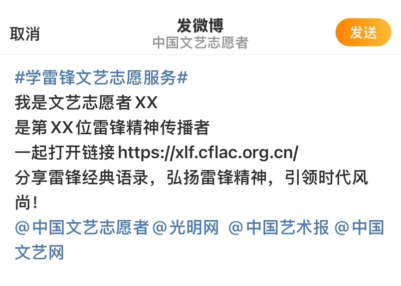 邀请全国广大文艺志愿者一起参与分享雷锋经典语录,弘扬雷锋精神,引领时代风尚。