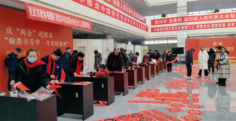 在灵武市两会现场,书法家们为人大代表和政协委员们送上新春祝福,祝愿他们在2025年履职尽责,为灵武市的发展贡献力量。