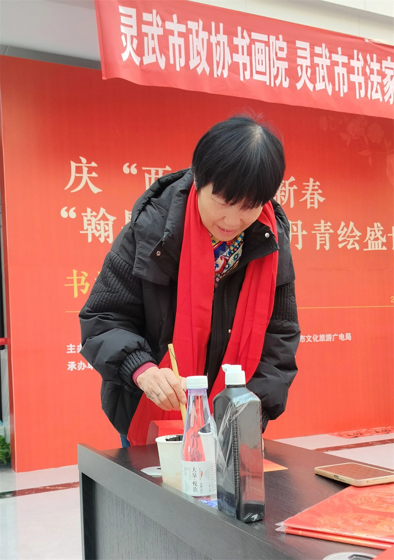 一张张摆满了笔墨纸砚的书桌整齐排列,书法家们神情专注,挥毫泼墨,笔走龙蛇。每一个笔画都蕴含着深厚的文化底蕴,每一个字都寄托着对灵武这片土地的深情祝福。