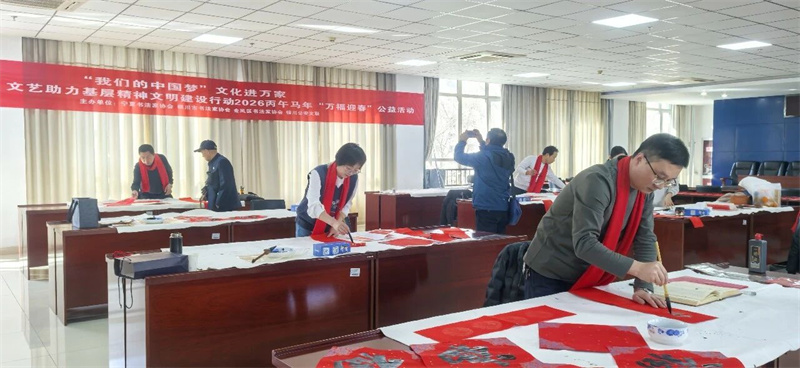 为认真落实中国文联2026年“强基工程”新春特别行动部署要求,广泛走进各行各业,为基层群众送春联、福字,丰富群众的节日文化生活,2026年2月5日,由宁夏书协、银川市书协、金凤区书协主办,金凤区文联、银川公安文联承办的2026年“强基工程”新春特别行动——“我们的中国梦 文化进万家”走进银川市公安局“万福迎春 写春联”文艺志愿服务活动在银川市公安局火热开展。