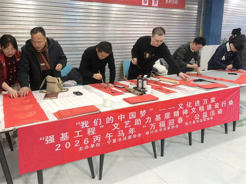 2026年2月11日,由宁夏书法家协会、银川市书法家协会、贺兰县书法家协会主办的“我们的中国梦 文化进万家”——“丙午马年 万福迎春 送春联”文艺志愿服务活动在贺兰县政务服务中心温暖举办。活动现场,贺兰县书协5位书法家,为该中心的工作人员书写春联及福字近400副。书法家们书写的春联内容,除了传统经典联句外,还应群众需求,书写了如“日日是好日,时时皆清欢”“平安喜乐常相伴,心想事成皆如愿”等充满时代气息的新式联语。此次活动将政务服务空间转化为一座传递城市温度的“文化驿站”,让群众于笔墨纸砚间感受中华优秀传统文化的深厚魅力,也将艺术家们对他们的节日祝福与人文关怀送达到群众心里。