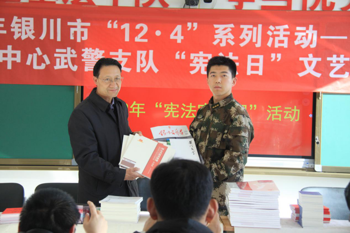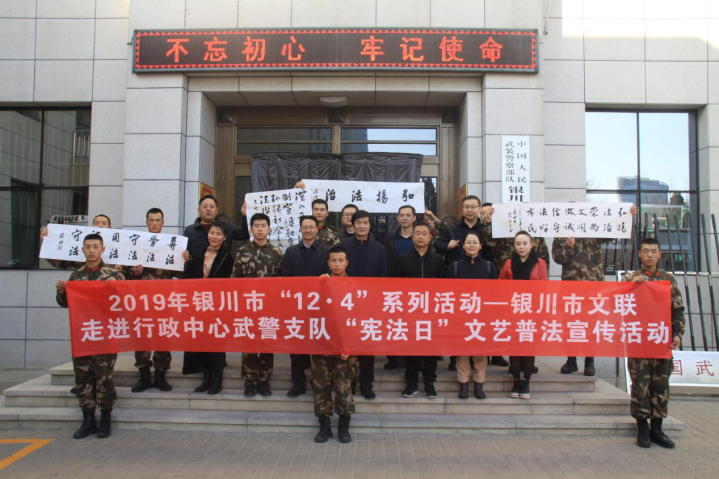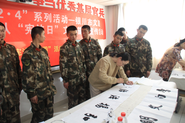活动现场,书法家为行政中心武警支队官兵书写了普法宣传内容的书法作品。文联干部向武警支队的官兵们发放《中华人民共和国宪法》手册,并赠送《黄河文学》杂志、《家风家训故事选编》、银川文艺界内刊。