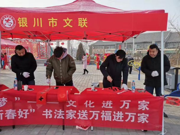 活动当天,金凤区良田镇新时代文明实践广场人头攒动,银川市书协骨干会员组成文艺志愿小分队,在严寒中为村民们现场写春联、送福字、剪纸、拍摄全家福。