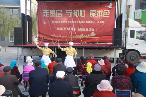 市文联党支部以“走基层 守初心 葆本色”为主题,组织文艺家们深入永宁县望洪镇靖益村和金星村,将一场精彩的文艺演出送到了群众家门口。舞蹈《奋进新时代》拉开了欢腾的序曲,《我是一条小河》《百花争艳》等欢快动感的乐曲在舞台上久久回荡,女生独唱《小康时代》唱出了对党的感激之情,相声《扶贫欢声》以方言和普通话的精彩对白,反映了农民进准脱贫后的幸福喜悦生活……,一个个接地气的节目让村民们过足了瘾,笑开了颜。此次活动,广大文化文艺工作者通过“身入、心入、情入”,发挥文艺功能,讴歌了伟大的党、伟大的祖国,全面展示了脱贫攻坚所取得的辉煌成就。