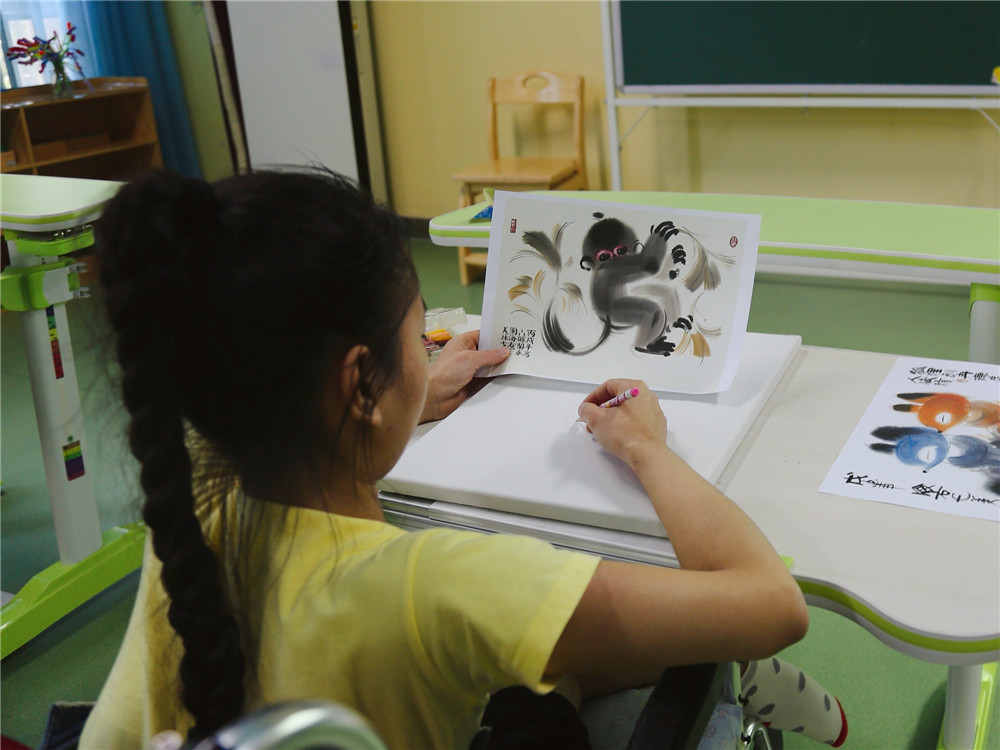 每一个孩子们都热情地迎接我们,他们高兴地喊到“老师好”。他们用画笔慢慢地描绘着美林小动物的线条,然后再涂上不同的颜色,这样一幅创作就大功告成了。一只黑色的猫头鹰,一只五彩的岩画牛,两只不一样的猴子……所有作品都是不同的,却承载着每一个孩子不同的梦想。他们给爱以最纯真的笑容,给生活以最简单的快乐。