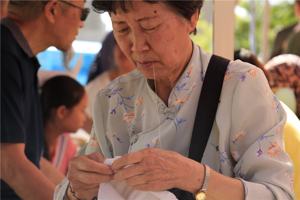 活动吸引了不少叔叔阿姨,他们仿佛找到了失散已久的组织,为此小区阿姨们广场舞都不去了。右手捻针,口抿线。即使炎炎夏日,依旧气定神闲,已然成为社区最稳!除了阿姨们,小男孩们也表现出了强烈的兴趣,果然女红要从娃娃抓起。叔叔一直坚定地坐在人群中,虽然未曾触及针线,但有时看着别人忙碌就是最大的满足吧,人生不过如此了吧。