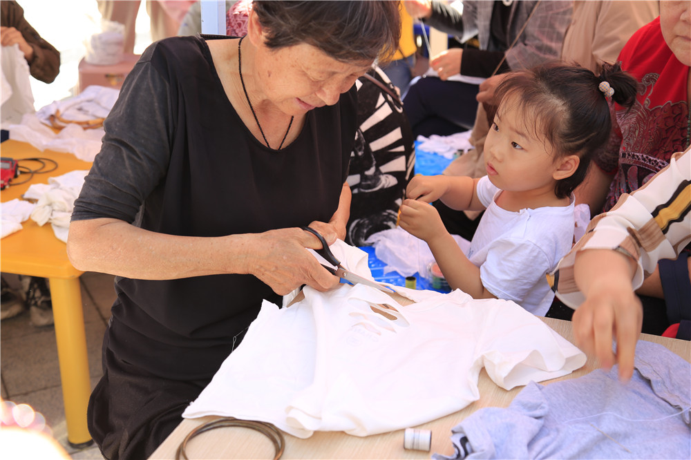 1、裁剪旧衣物 居民们搜腾出自己的废旧衣物、也许还有老伴儿和孙子的T恤,满满几堆!!!