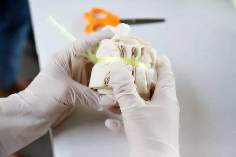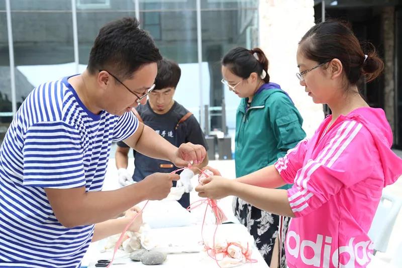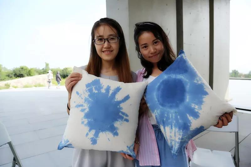 扎染抱枕的独特之处就在于不断的创新,没有重复,即使同一款布料,同一种颜色,同样的捆扎,最后染出来的也是不一样的色彩与图案,是机械印染难以达到的效果。现场色彩斑斓,大家用不同的色彩、不同的制作方式表达了对传统七夕的热情。