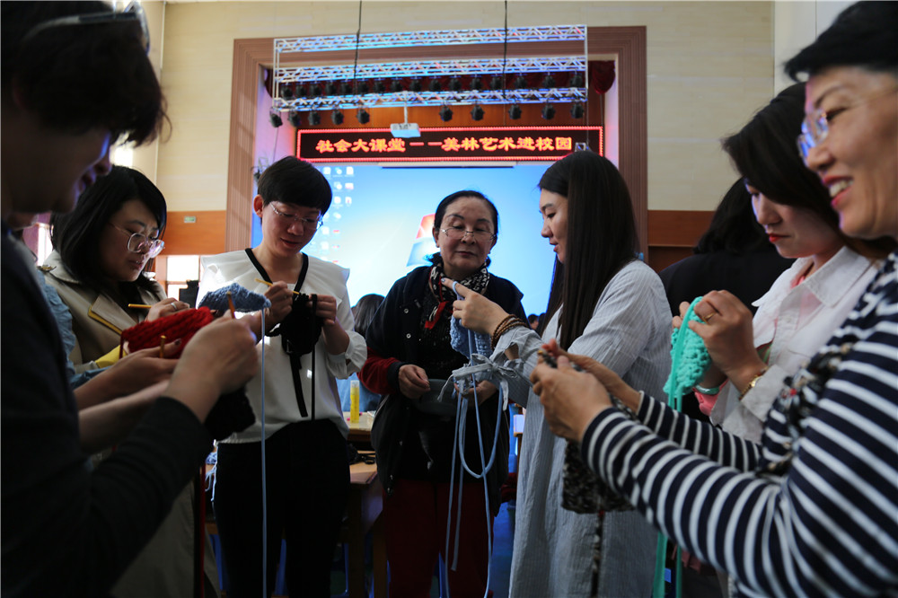 教室里,每张桌子上都摆放着不同色彩的毛线团和各种样式的钩针,孩子们洋溢着青春笑容,家长们都认真注视着讲台上的老师,空气中弥漫着温馨的氛围。