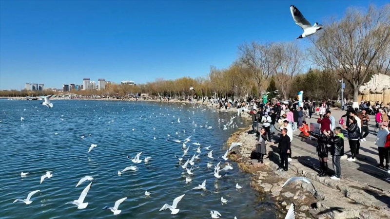 ▲北塔湖迎来大批南迁的红嘴鸥驻足、栖息,吸引众多市民前来观赏
