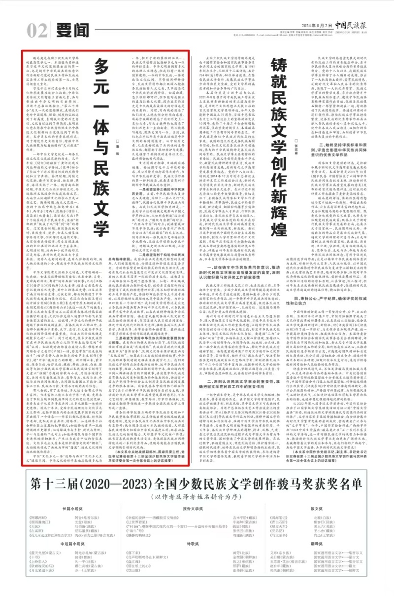 三是希望为讲好中华民族共同体故事提供有力保障。在美西方的强大舆论打压下,我们民族团结故事被歪曲成“民族同化”,民族地区现代化发展被歪曲为“资源掠夺”,民间文化传承保护被歪曲为“文化灭绝”。如果我们不奋起创造新的叙事,中华民族的故事就将被定格在这些谎言之上。我们的民族文学创作应担负起历史使命,把中华民族共同体的故事、经验、人物汲取到创作中来,面向海内外不同人群讲好真实的中国故事,讲清楚中华民族是具有强大认同度和凝聚力的命运共同体,讲清楚中国共产党领导和社会主义制度是各民族共同发展进步的根本保证。国家民委和中国作协已联合印发了《关于以铸牢中华民族共同体意识为主线,推动新时代民族文学事业高质量发展的意见》,可在文艺创作、评奖颁奖、教育培训、作家作品版权、民族语文翻译等领域进一步推动全国民族文学工作形成一盘棋。
