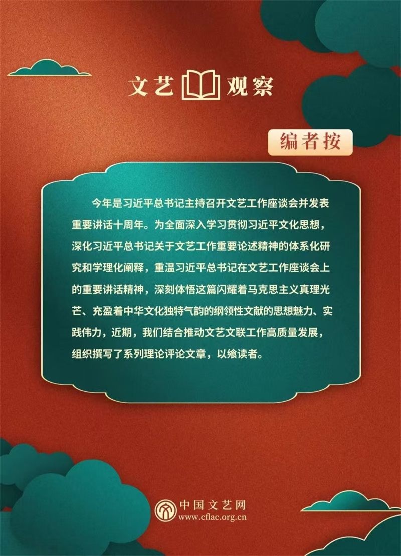 今年是习近平总书记主持召开文艺工作座谈会并发表重要讲话十周年。为全面深入学习贯彻习近平文化思想,深化习近平总书记关于文艺工作重要论述精神的体系化研究和学理化阐释,重温习近平总书记在文艺工作座谈会上的重要讲话精神,深刻体悟这篇闪耀着马克思主义真理光芒、充盈着中华文化独特气韵的纲领性文献的思想魅力、实践伟力,近期,中国文艺网结合推动文艺文联工作高质量发展,组织撰写了系列理论评论文章,以飨读者。
