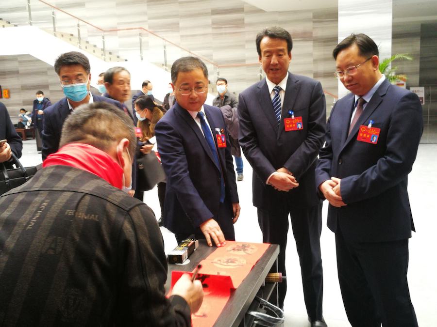 “人逢盛世千家乐,户沐春阳万事兴”、“有福人家牛报喜,无边春色燕衔来”大家一边欣赏着春联作品,一边排队等候,现场一片喜气洋洋。代表委员们纷纷表示,这次参加两会,不但收获了两会精神的鼓舞,同时也收获了一份特殊的礼物——春联,整个活动在一片欢乐的气氛中圆满结束。这次活动得到了灵武市领导及与会代表委员们的一致赞同和好评。银川市委副书记、灵武市委书记刘国强、人大常委会主任郑学文、政协主席杨文炯、市委常委、宣传部长黄丽等领导亲临现场进行观摩和指导。