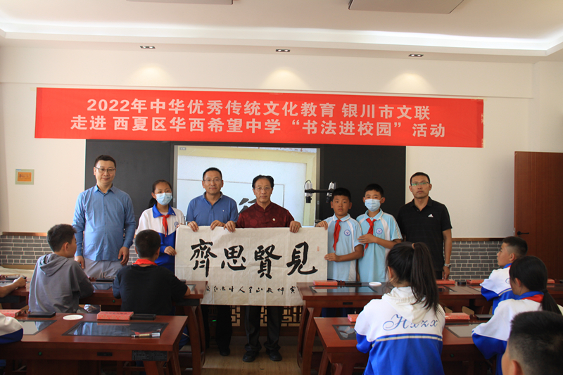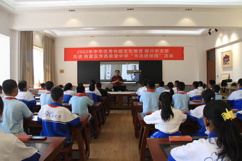 为大力开展中华优秀传统文化教育,近年来,银川市文联以承载着中华传统文化精粹的书法艺术为切入点,常态化组织书法家走进我市中小学,普及中国书法知识,现场讲解、示范,提升中小学生书法审美能力,增强对书法艺术的兴趣,从而喜欢上书法,练习书法,让中国书法艺术在青少年中得到弘扬和传承。