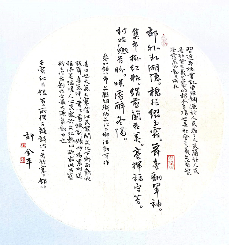 第三届“雷锋杯”公益书画作品展组委会于2022年6月28日向全国各书画机构、书画名家及广大书画爱好者发布征稿启事,得到广泛响应支持,共收到来自全国各地投稿4012件(其中书法作品3510余件,美术作品502件)。初评过后,由湖南省书协、湖南省美协、湖南省画院组成评委会,在雷锋小学对初选800件作品进行终评,遵循公平公正原则,严谨认真评审,最终评出书法类一等奖1名、二等奖3名,三等奖5名,优秀奖53名,入展作品76件,入选作品70件;美术类一等奖1名、二等奖3名,三等奖5名,优秀奖49名,入展作品27件,入选作品49人。银川书画院青年书法家许金平行书作品《咏美丽银川志愿服务主题自撰诗选抄》荣获全国第三届“雷锋杯”公益书画作品展优秀奖。