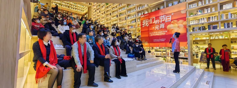 在银川市的网红书店钟书阁,银川的朗诵艺术家们为群众献上了一场诗文朗诵会,以朗诵艺术重现诗文之美。走近钟书阁,就听见,“袨服华妆着处逢,六街灯火闹儿童”,一首元好问的《京都元夕》朗诵作品正在上演,悦耳的声音重现着金代京都的元宵盛景。本场朗诵会分为“抬眼空中月圆、明月千里相思、垂眸春和景明”三个篇章,通过古诗、散文、现代诗的朗诵展现赏月、团圆、迎春的元宵主题,辅之以精美的服化道和舞台设计,用传统之美妆点建发现代城这座老城的新地标。